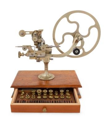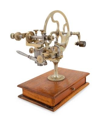 mounted to a wood base, the base drawer with extra bits and cutting wheels.