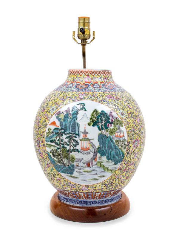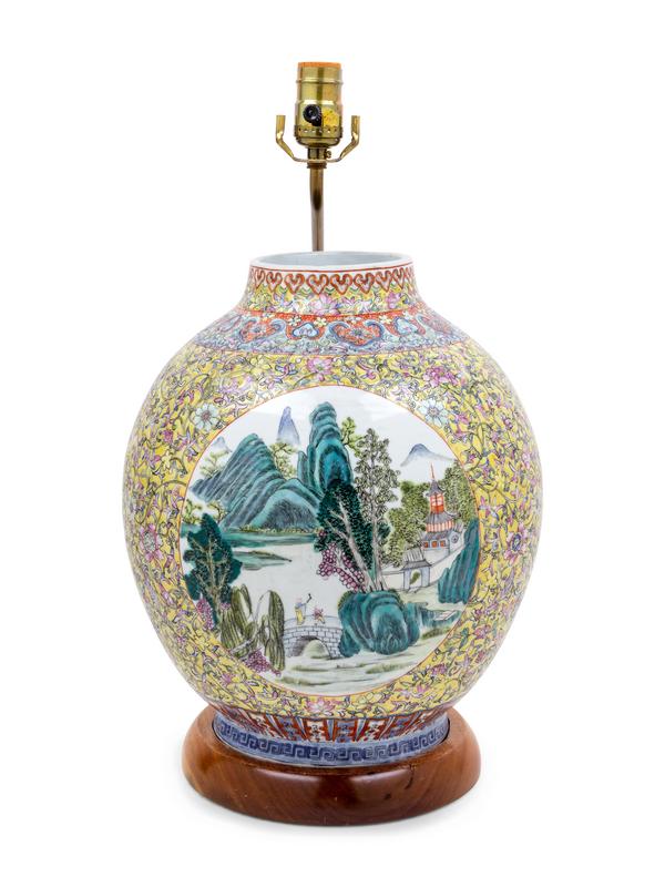 painted with a landscape reserved on a floral vine-decorated yellow ground.