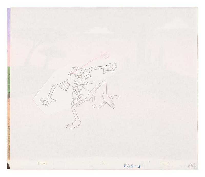 12-field production cel, printed test background, matching ink drawing. Stamped "P38-8", annotated lower right "p44". In clear "MCA Animation Art" sleeve.