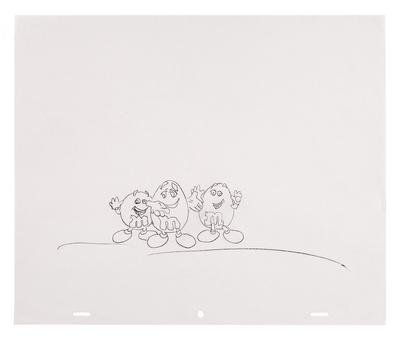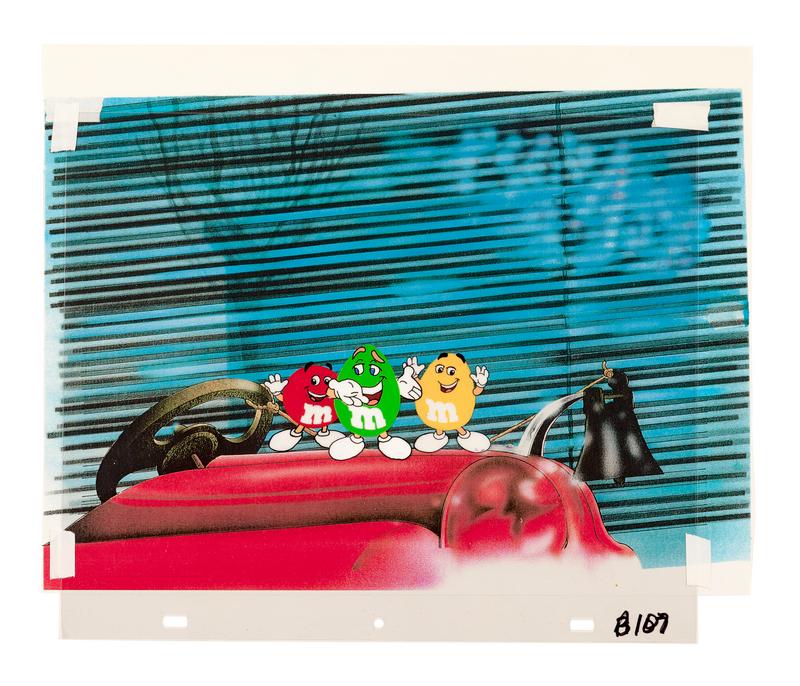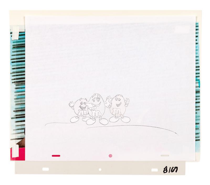 12-field production cel, 2 cel setup, printed test background. Annotated lower right "B107."