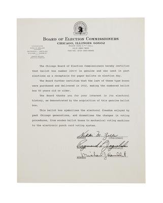 Provenance: Typed letter certifying the authenticity of ballot box number 226-C. Signed by members of the Chicago Board of Election Commissioners, Nikki M. Zollar, Raymond L. Jagielski, and Michael J. Hamblet.