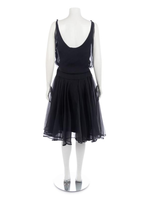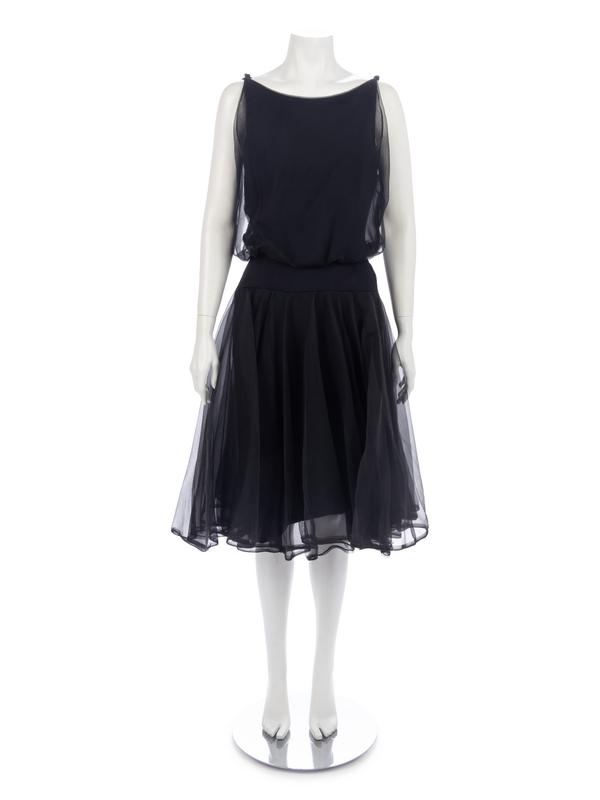 Black silk crepe dress with sheer overlay, buttoned shoulders, bloused top, and straight skirt with flounced overlay.