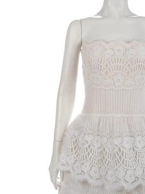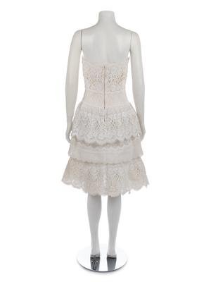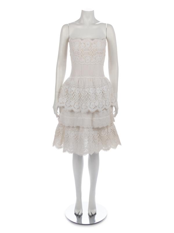 White cotton lace strapless dress with net petticoat under a tiered full skirt, and center back zipper closure.