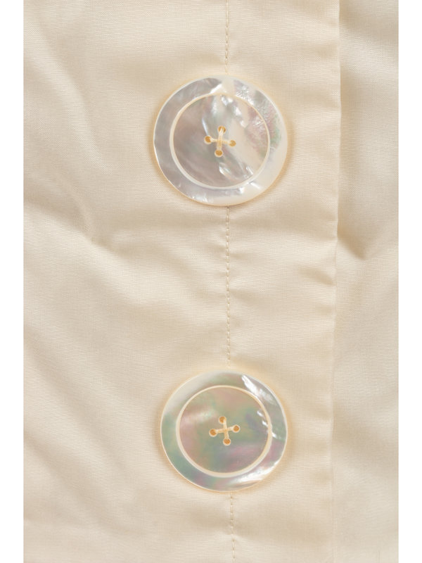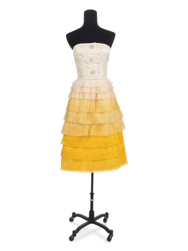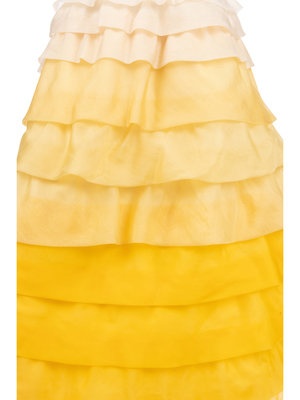 Multi-yellow hued tiered organza and gazar strapless dress with center front pearl button detail, center back zipper closure, and Pellon interfaced A-line skirt.