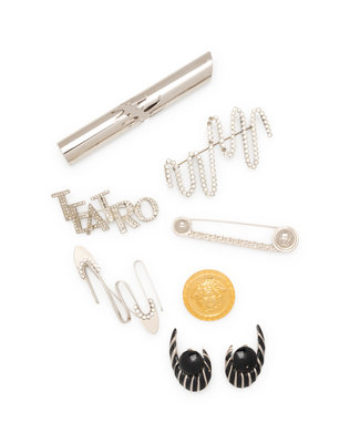 Silver-tone Medusa head and Greco pattern safety pin.