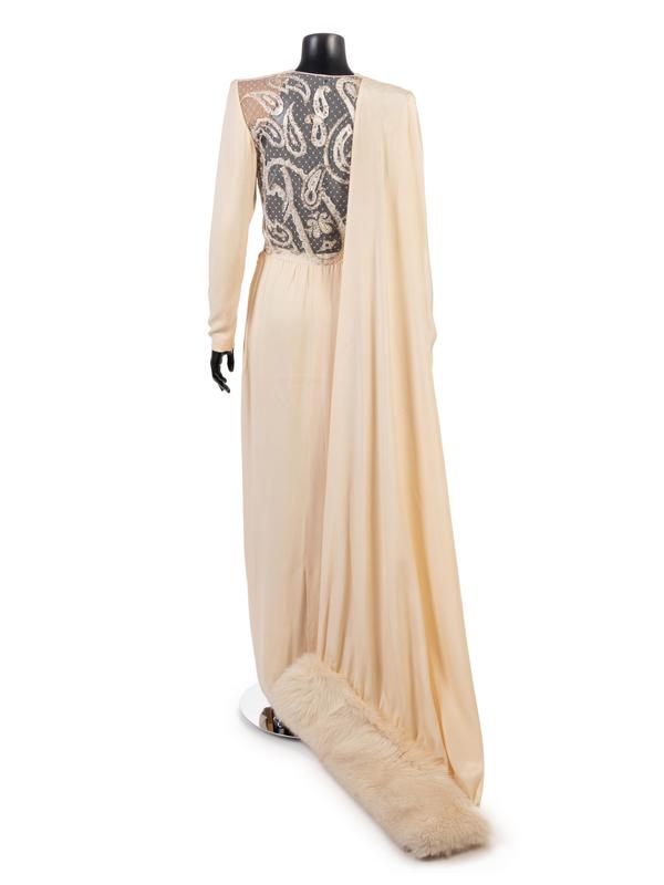 Off-white silk crepe draped bodice evening dress with self fabric wrap trimmed in white fur. Entire back is made of white net embroidered with a paisley design in glass beads, rhinestones, and sequins.