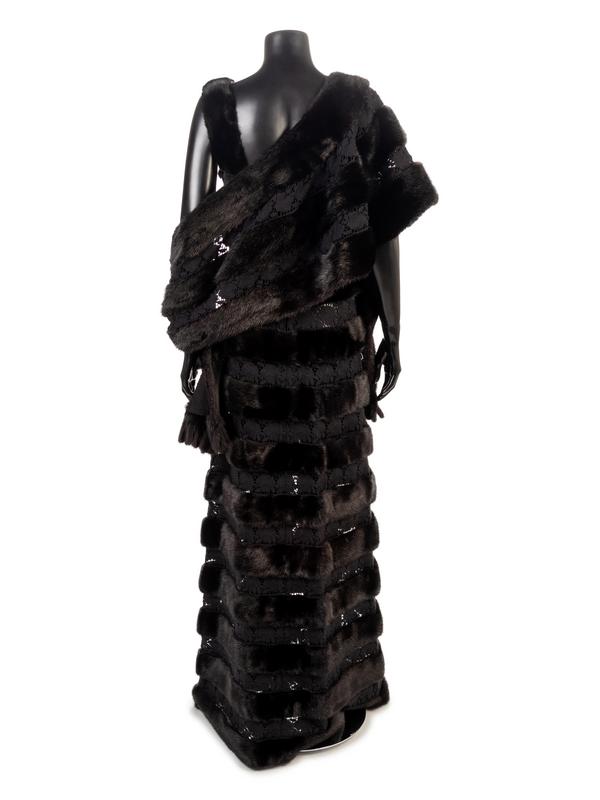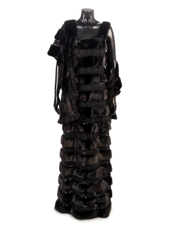 Black fur and black cotton lace banded sheath dress with matching wrap.