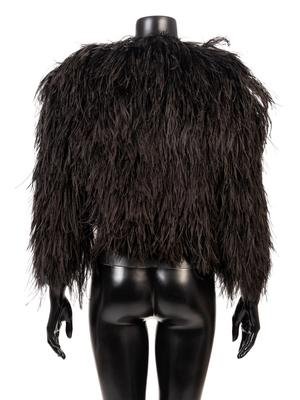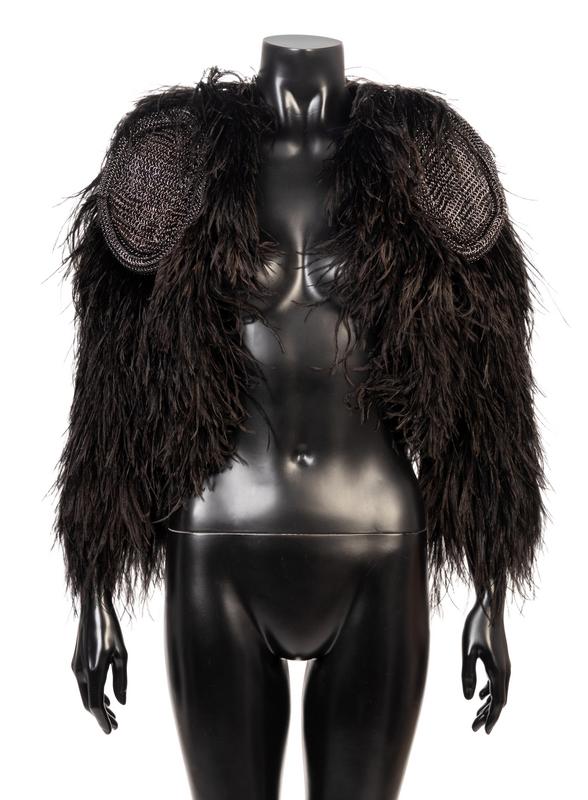 Black ostrich feather bolero jacket with cropped sleeves and black metal chain mail epaulets.