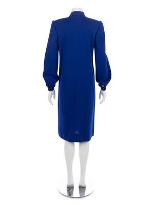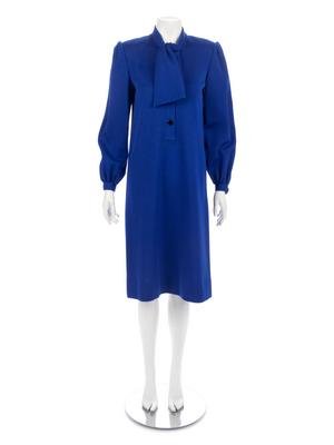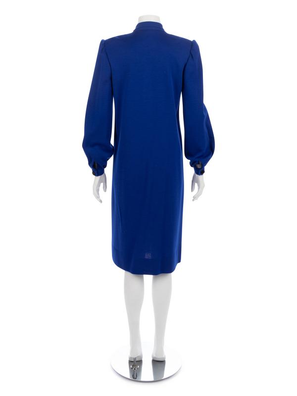 Bright blue wool knit jersey dress with tie collar, half button down center front closure, full gathered sleeves, and A-line skirt.