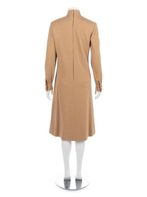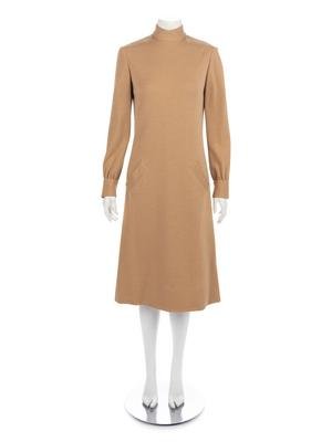 Tan wool knit jersey dress with stand collar, full gathered sleeves, front hip pockets, and center back zipper closure.