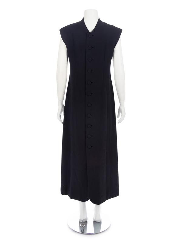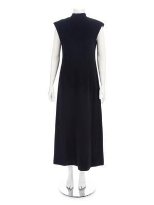 Black wool crepe sleeveless dress with stand collar and center back covered button closure.