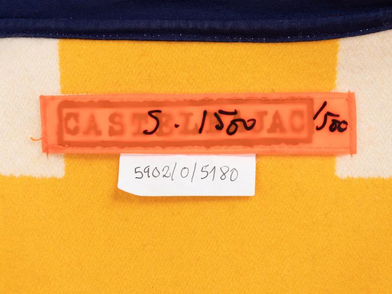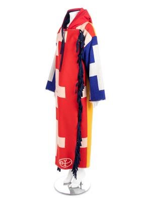 Red, yellow, blue, and off-white wool pea coat with a cross pattern throughout, red canvas outer hood with blue drawstring inner hood, and trimmed in clear vinyl and blue fringe.