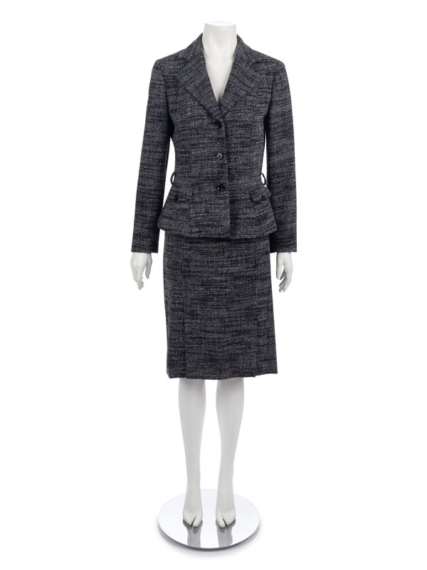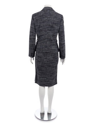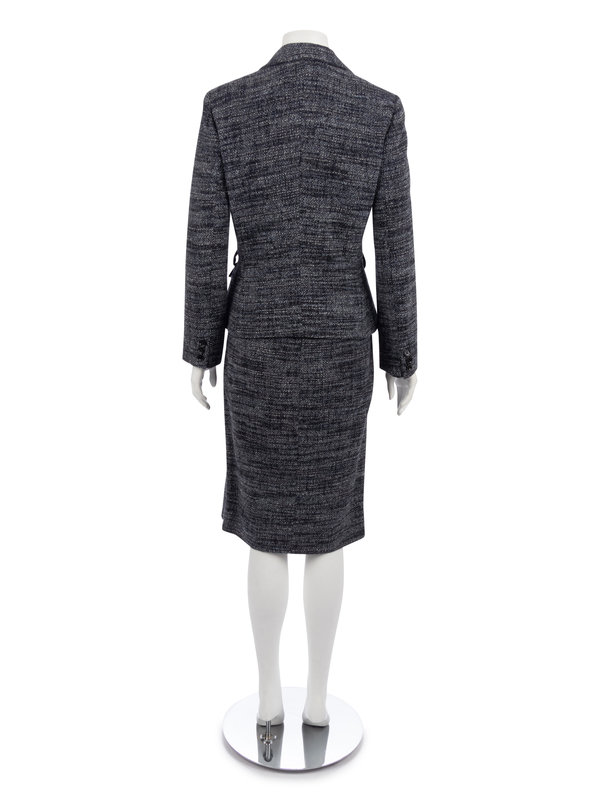 Variegated blue alpaca/wool blend boucle suit jacket with notch lapel, front hip pockets, and center front button closure; paired with matching straight fit skirt with front double slit.