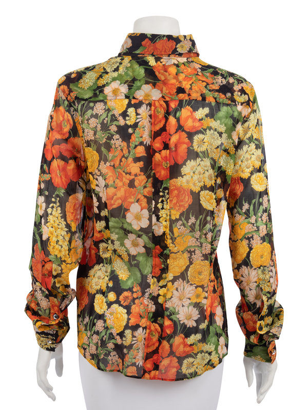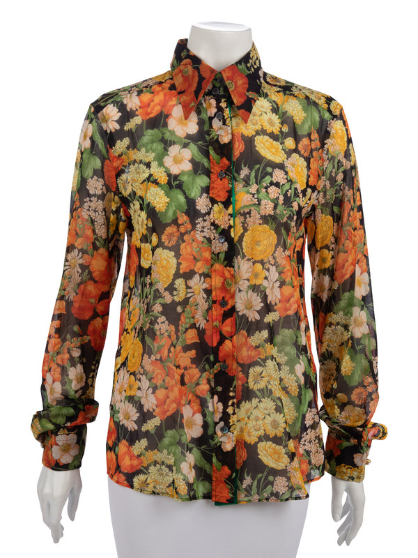 Black cotton sheer dress shirt with warm-hued floral print, large rhinestone cuff buttons, and green satin placket facing.