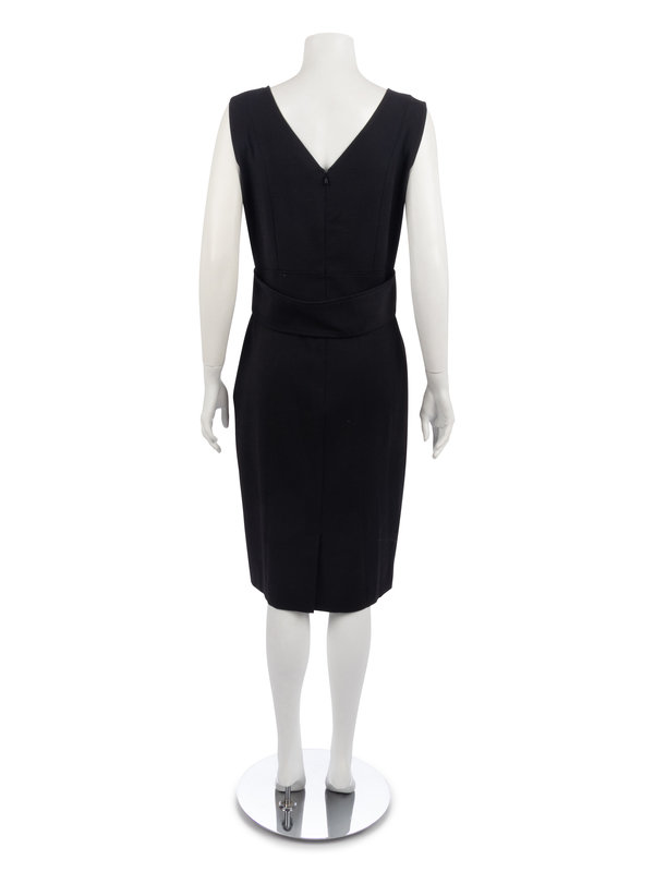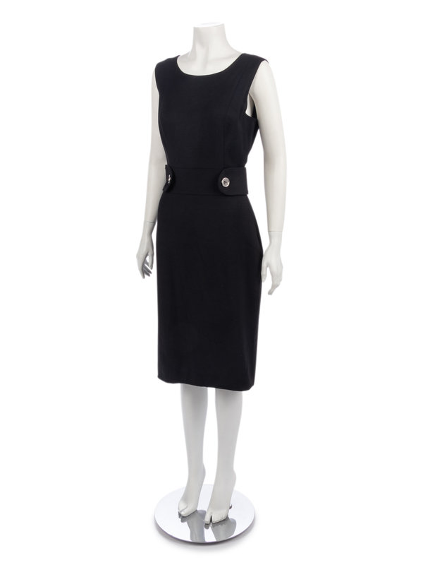 Black wool/nylon blend crepe sheath dress with silver-tone buttoned banded belt.