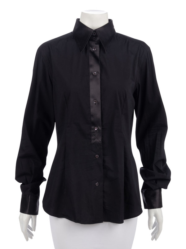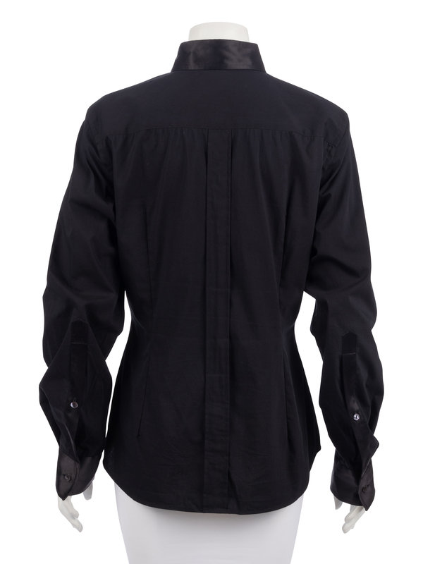Black cotton/nylon blend dress shirt with black satin collar, placket, and sleeve cuffs.