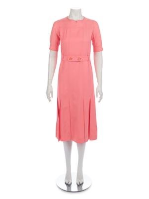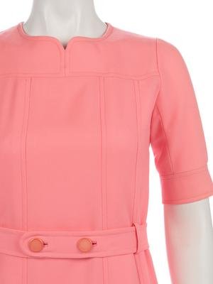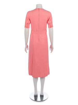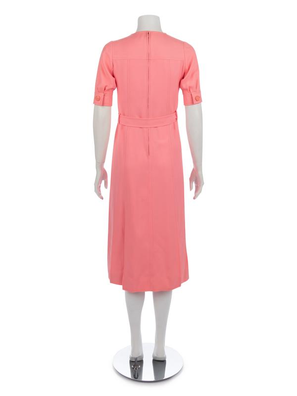 Pink wool blend gazar day dress with stylized neckline, short sleeves, belted waist, flared skirt, and center back zipper closure.