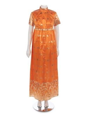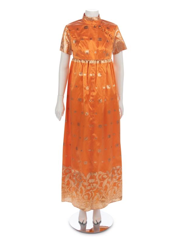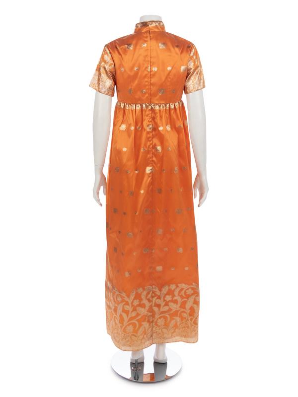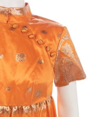 Orange and gold-tone lame brocade dress with mandarin collar, short sleeves, high waist, and center back zipper closure.