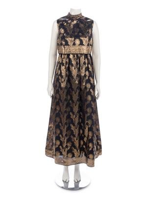 Black and gold lame dress with a stand collar, box cut outer bodice, high waist, flared skirt, and center back zipper closure.