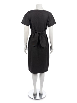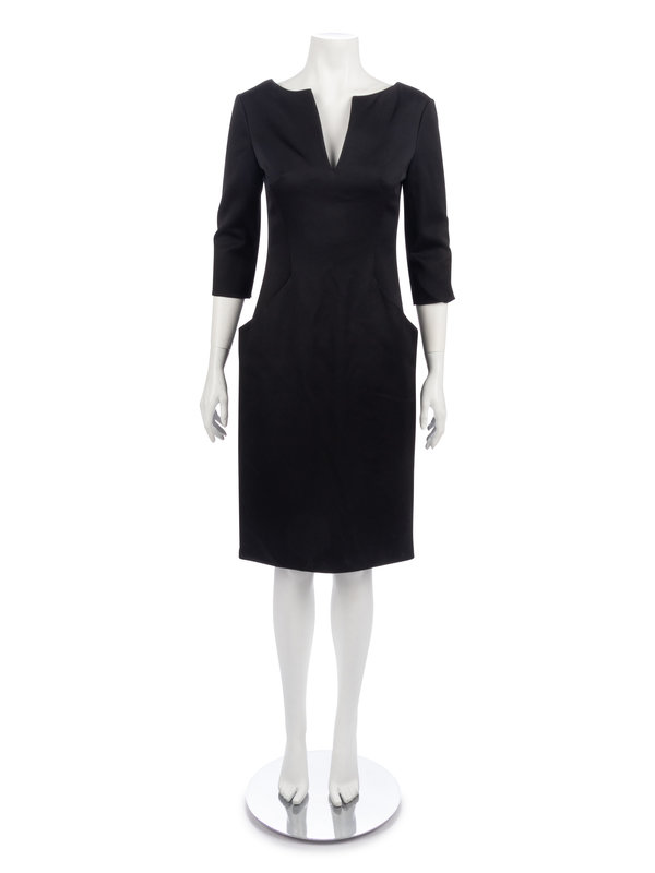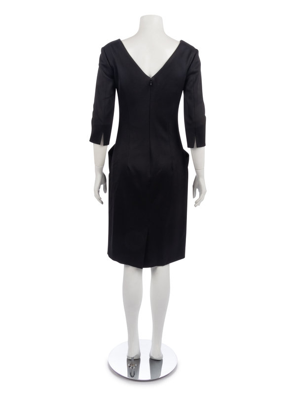 Black wool dress with three quarter sleeves, inset hip pockets and center back zipper closure.