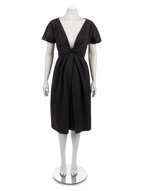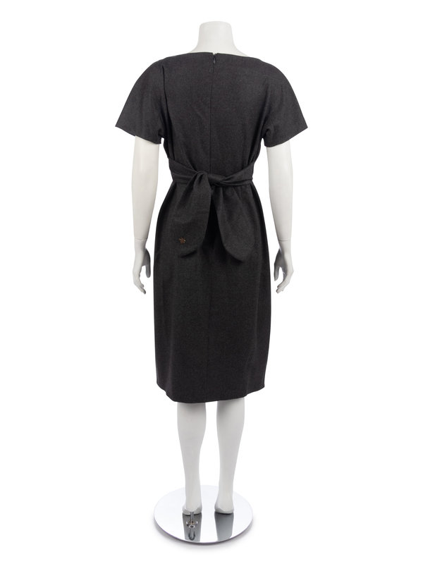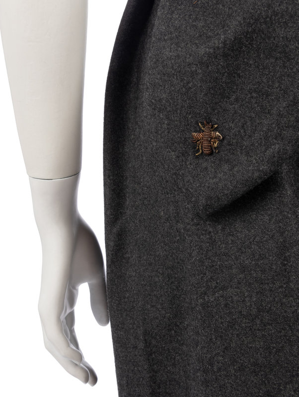 Gray wool/cashmere blend dress draped front , pleated skirt, and attached tie belt with metallic thread embroidered bee.