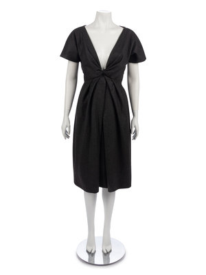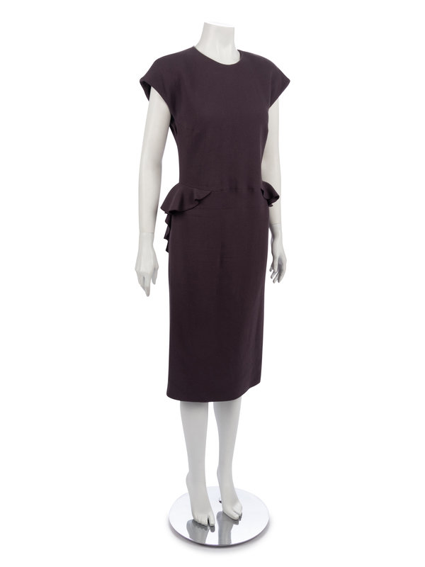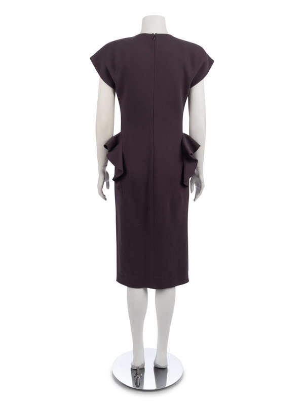 Purple gray wool crepe dress with drop shoulders, hip flounces, and center back zipper closure.