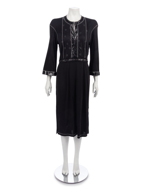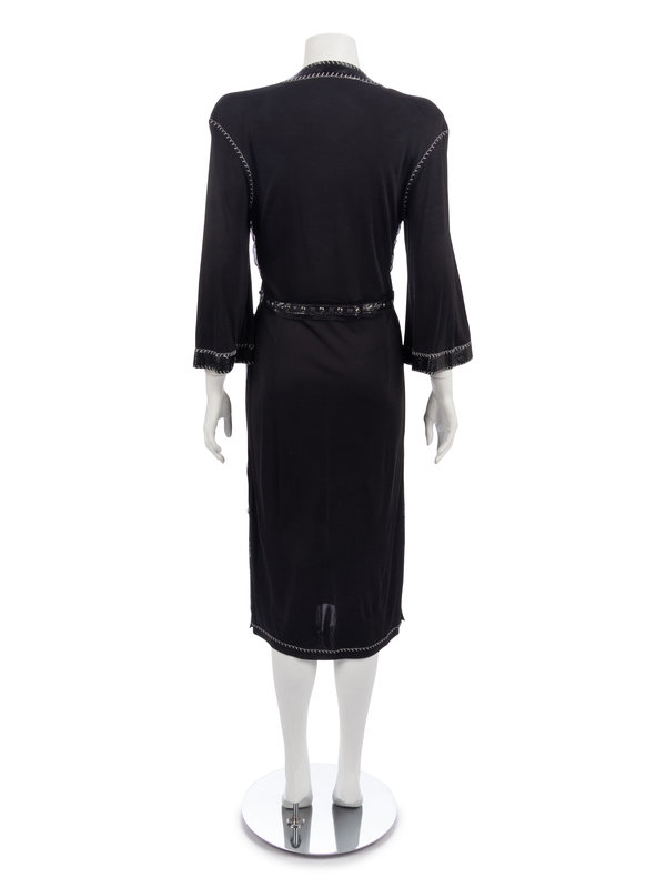 Black rayon/silk blend knit dress trimmed with black snakeskin textured leather at neckline, sleeve cuffs, and at waist with metal studs, synthetic net with spots, and left side zipper closure.