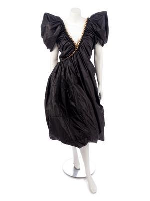 The neckline and the 'sleeves' are constructed in a way that offers multiple ways in which the dress can be worn. The dress can be worn with a deep V-neckline in front and back. The dress can also be worn, as featured on the runway, with the tops of the sleeves/shoulders pulled over the head, with the head coming out of a second opening in the sleeves. Both of these versions are shown in the images in this listing.