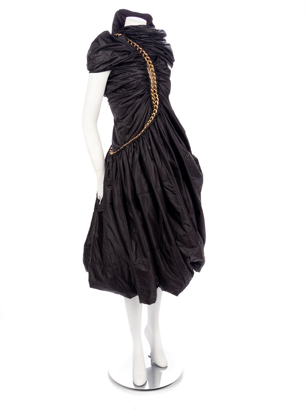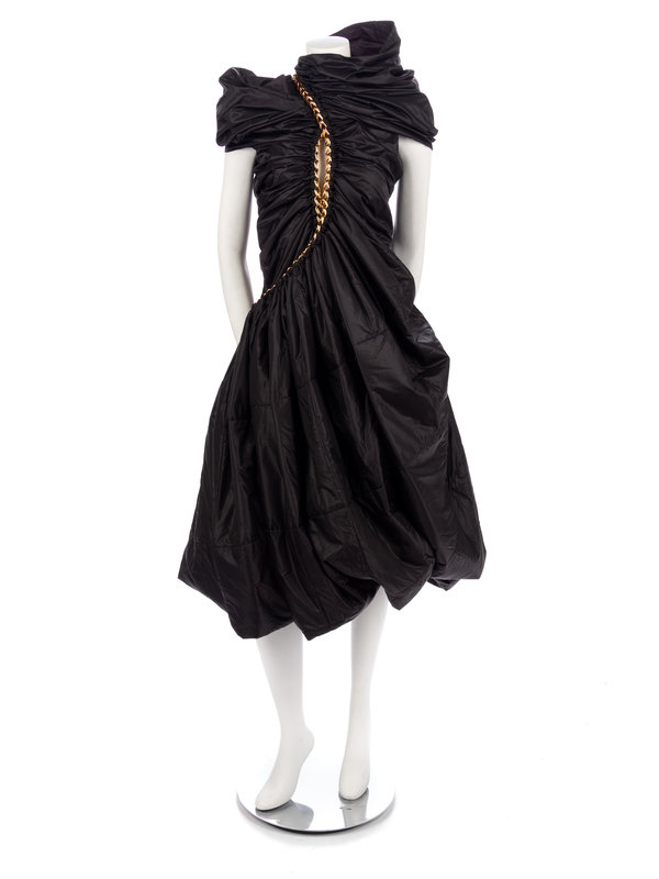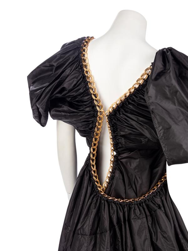 Black nylon quilted draped dress with polyester filling and gold-tone chain neckline detail.