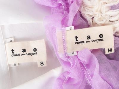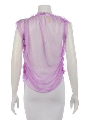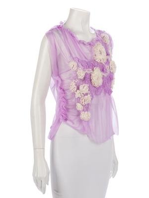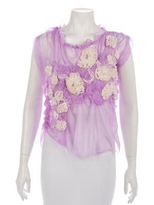 Light purple polyester knit bubble top with white cotton shirring and applique detail.