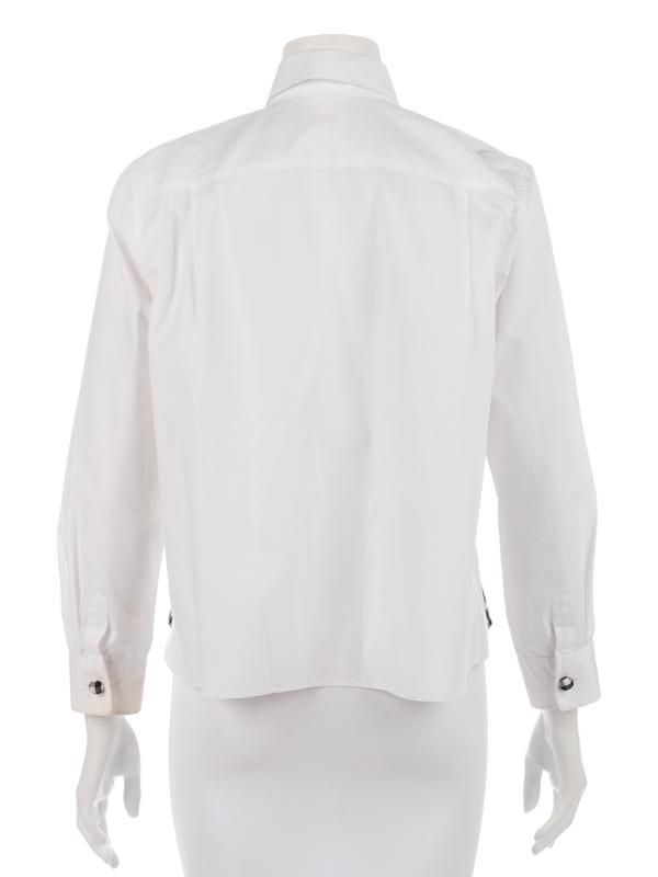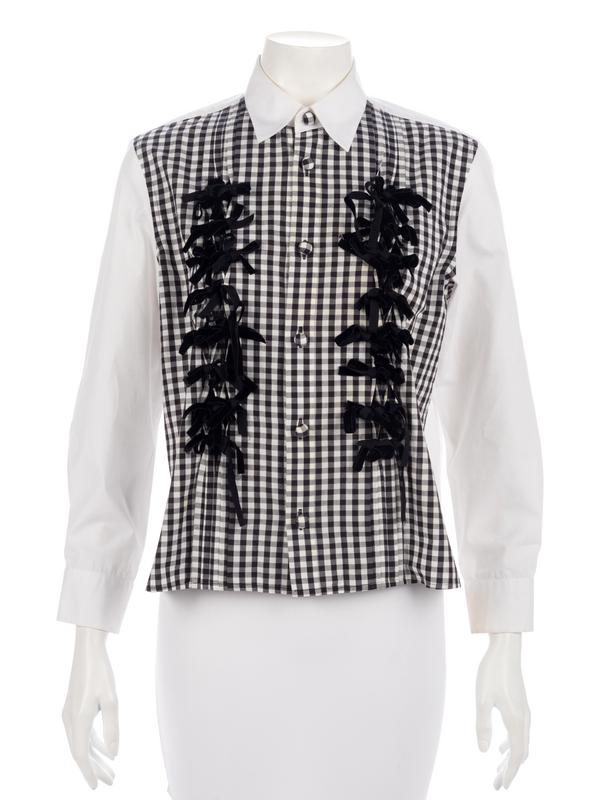 Black and white cotton gingham check and white broadcloth shirting with black velvet bow detail and center front covered button closure.