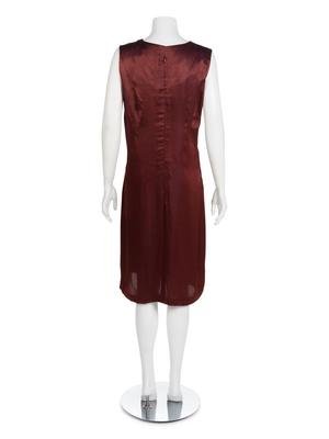 Iridescent rust and purple acetate blend satin shift dress with V-neck and center back zipper closure.