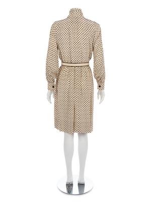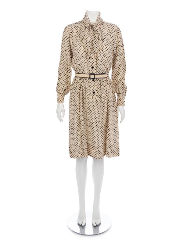 Cream silk crepe with black printed tulips, tie collar, three quarter center front button up closure, barrel cuff sleeves, and gathered skirt with leather and woven fabric belt. 1970s-80s.