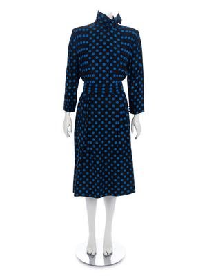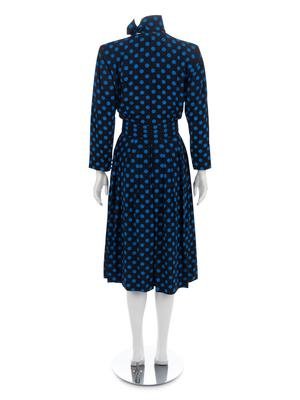 Black with blue polka dot dobby weave dress with an all over square satin pattern, attached neck tie, full sleeves, pleated skirt with belt, and center back zipper closure.
