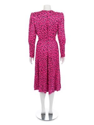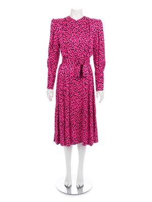 Bright pink, red, and black abstract print satin dobby weave dress with v-neck, full gathered sleeves, pleated skirt, center back zipper closure, and scarf.