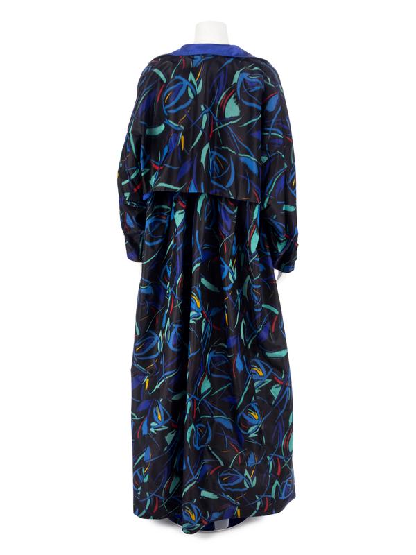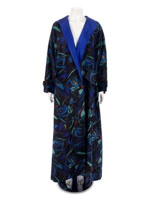 Black chintz swing coat printed with multi-hued abstract shapes, a stand collar, dolman sleeves with belted cuffs, and hip flap pockets.