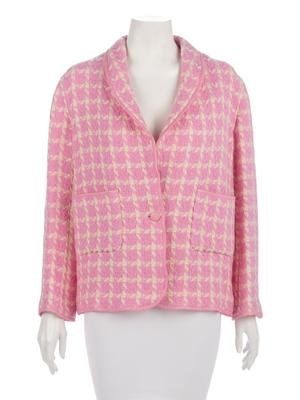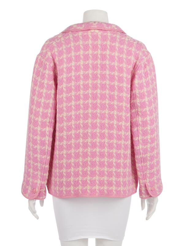 Pink and white wool blend woven houndstooth box cut jacket with shawl collar, front waist patch pockets, and single button center front closure. From the 1996 Spring Collection.