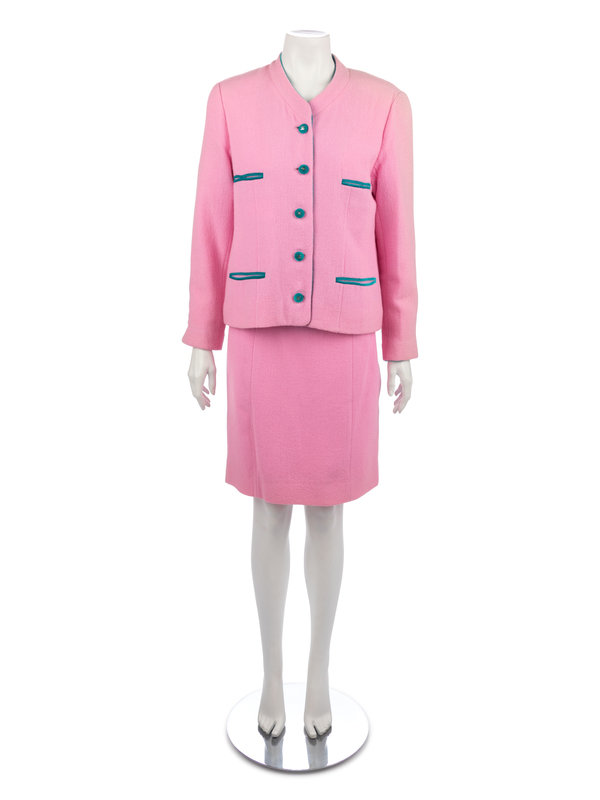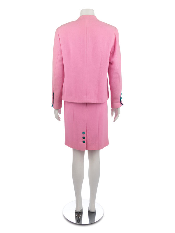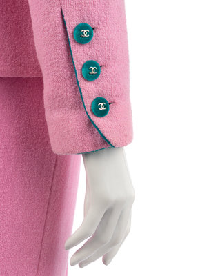 Pink wool/nylon blend boucle box cut suit jacket trimmed in teal velveteen at neckline, welts, and front button CC logo closures; paired with matching straight fit skirt trimmed in teal velveteen at waist band. From the 1996 Spring Collection