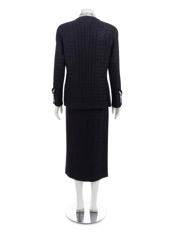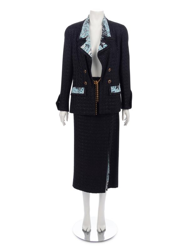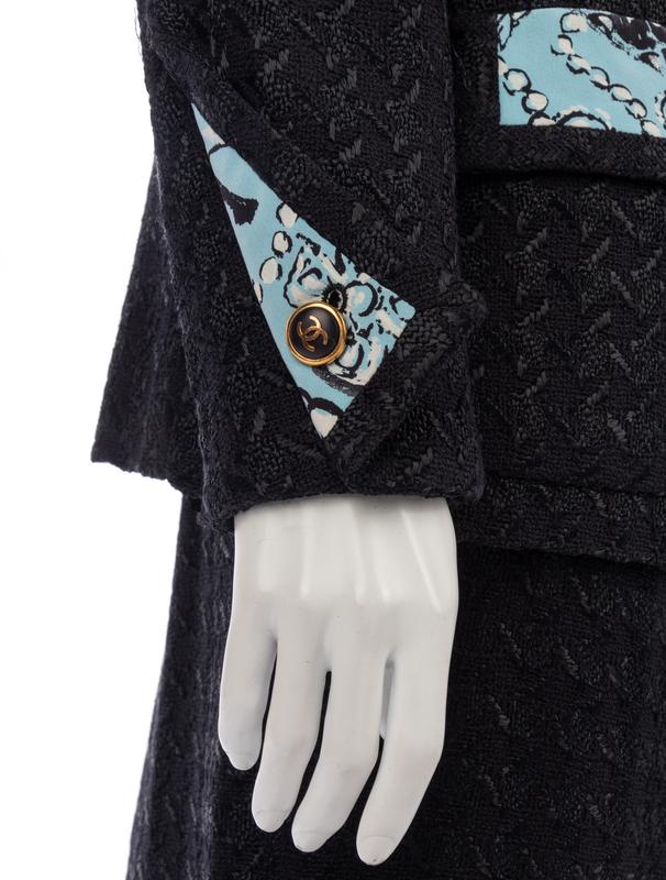 Dark blue rayon/cotton/silk blend woven houndstooth pattern suit jacket with printed light blue silk facing and lining, front hip patch pockets, and gold-tone metal chain closure at center front; paired with matching skirt. From the 1993 Spring Collection