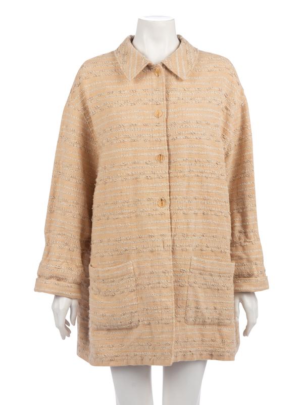 Tan wool/cotton blend woven box cut jacket with roll collar, front hip patch pockets, and refractive plastic buttons at center front.