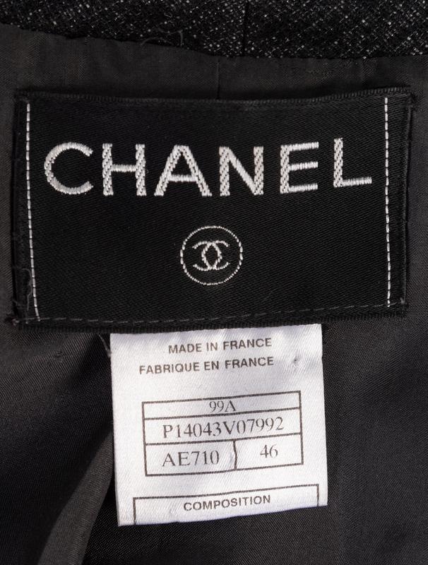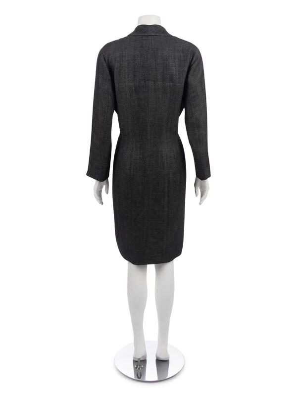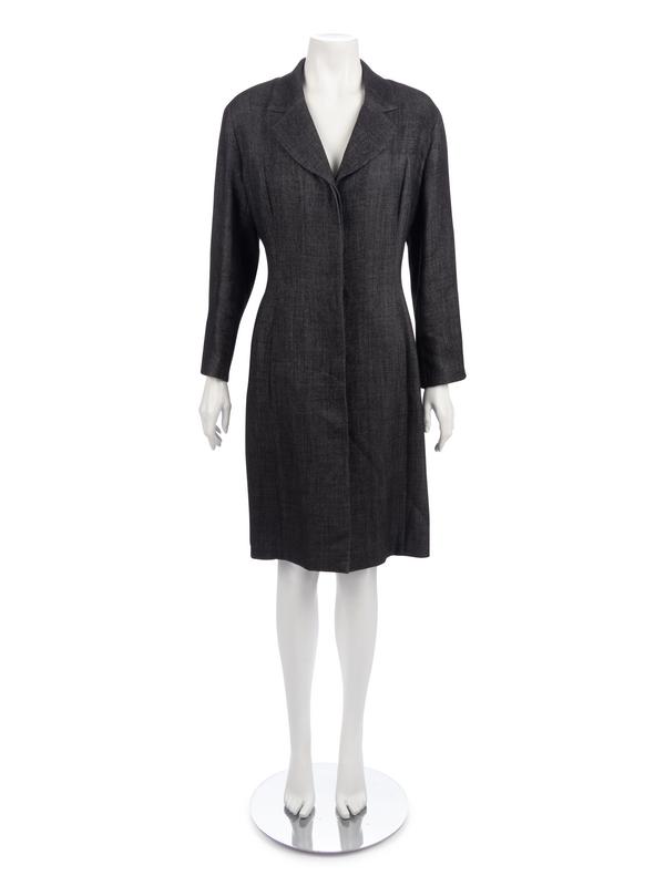 Dark gray wool/ polyester/nylon blend long jacket with single notch lapel and hidden front button closure.