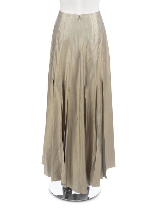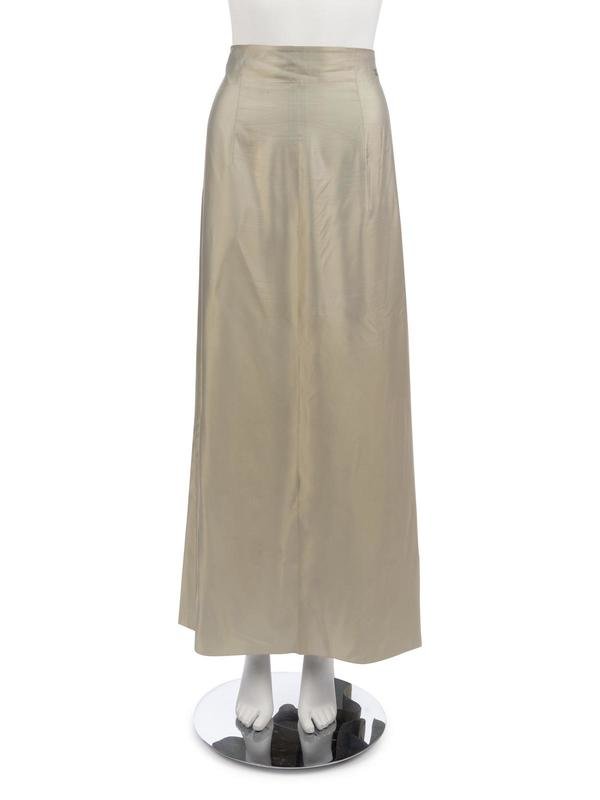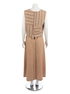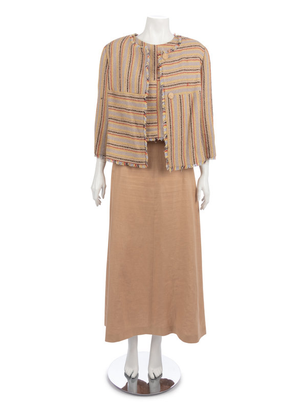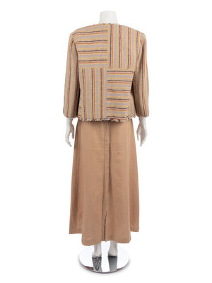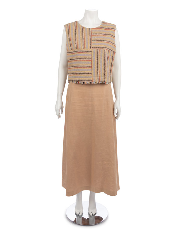 Neutral wool/nylon blend striped suit ensemble includes cropped jacket with unfinished edging, sleeveless crop top, and linen straight skirt.
