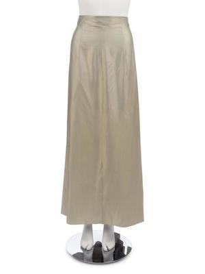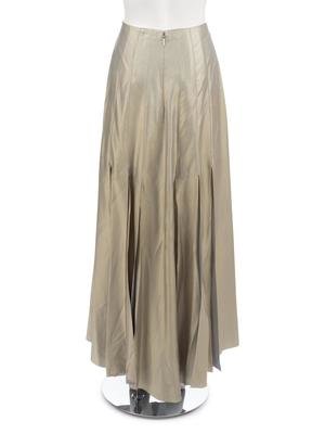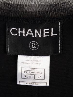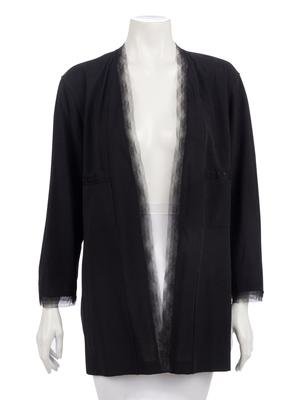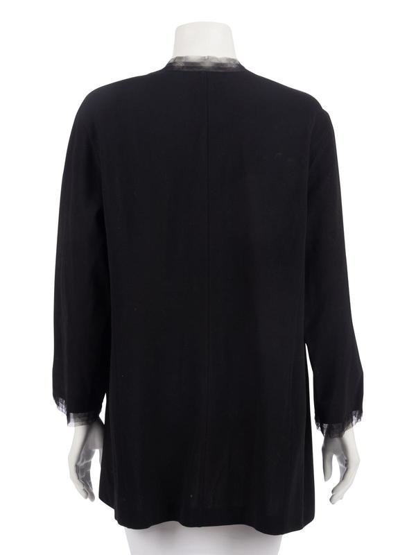 Black wool jersey knit jacket trimmed in black nylon net and paired with light green and blue acetate/silk blend paneled skirt