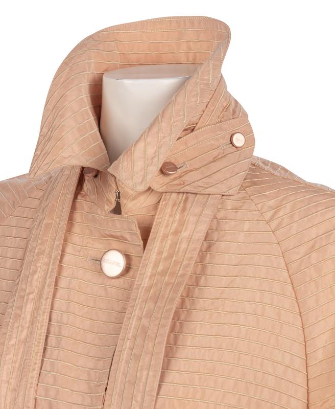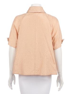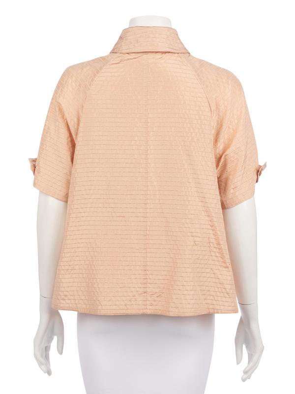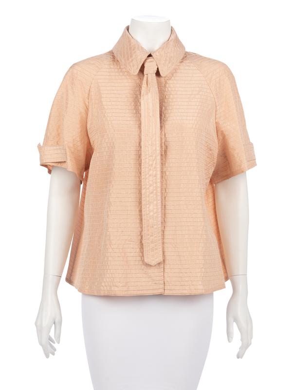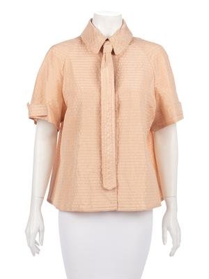 Soft pink silk ribbed button down shirt with front neck guard, leather covered buttons, and tie.