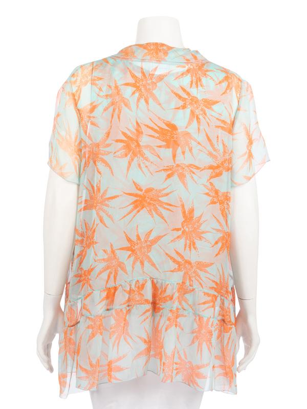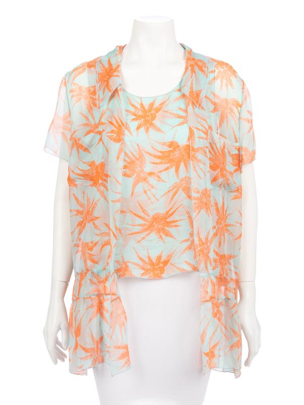 Light blue and orange leaf print silk blouse set with sleeveless two-layered shell and short sleeve over shirt with gathered hem.