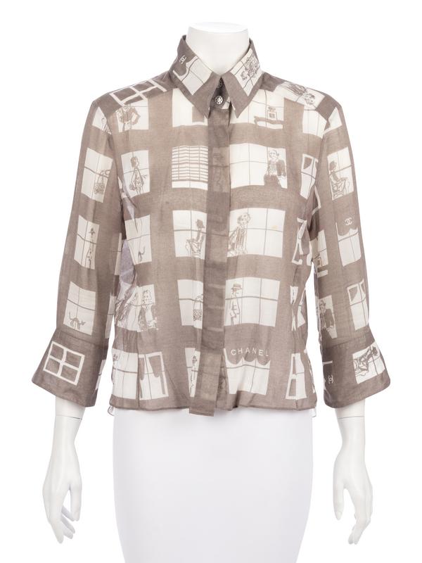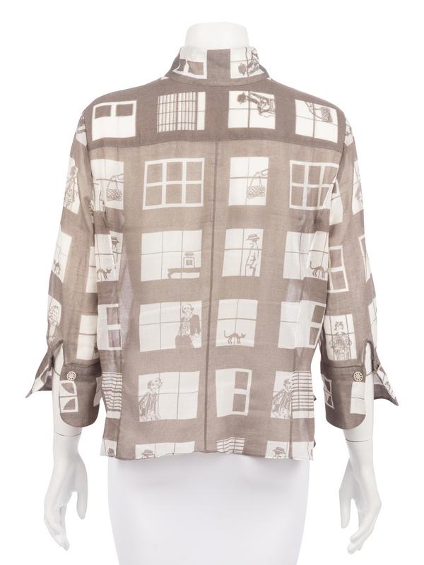 Gray and white cotton blouse with office window and people print, stylized rounded french cuffs with shell cuff links, and hidden front button closure.