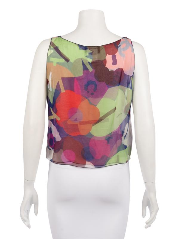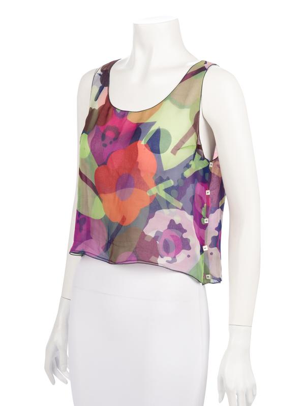 Multi-hued floral print silk crepe sleeveless two-ply shell with small square shell buttons on the left side.
