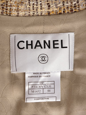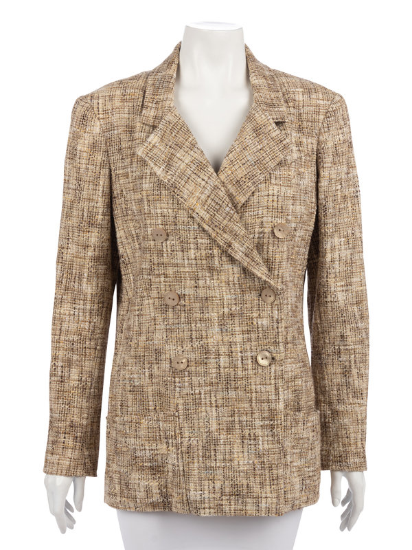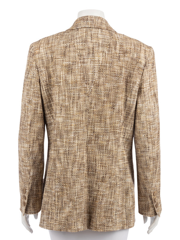 Ivory and dark brown cotton/rayon blend boucle double-breasted suit jacket with notched lapel and front patch pockets.