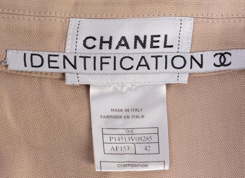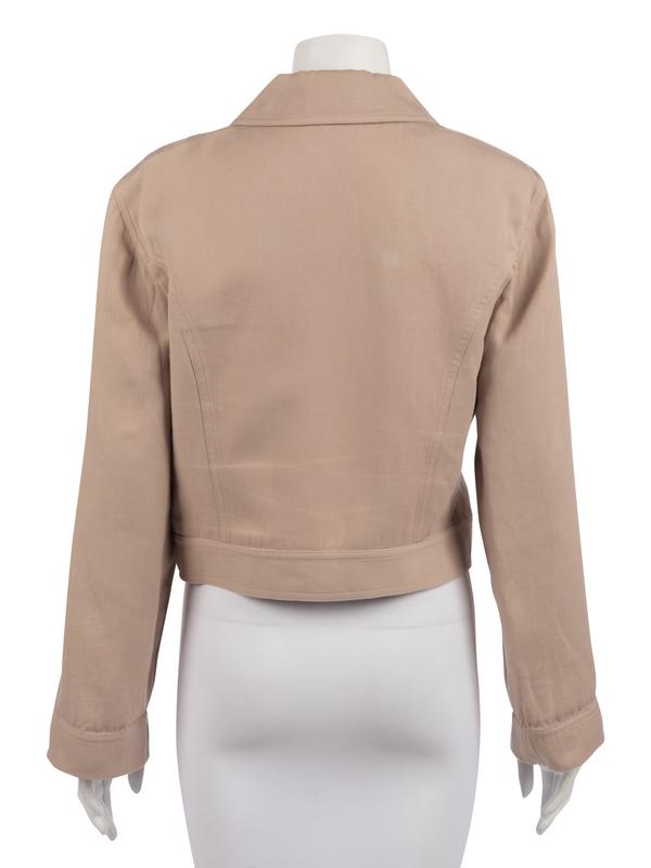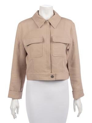 Taupe cotton canvas "Eisenhower" style jacket with roll collar, chest patch pockets, and zippered front closure.