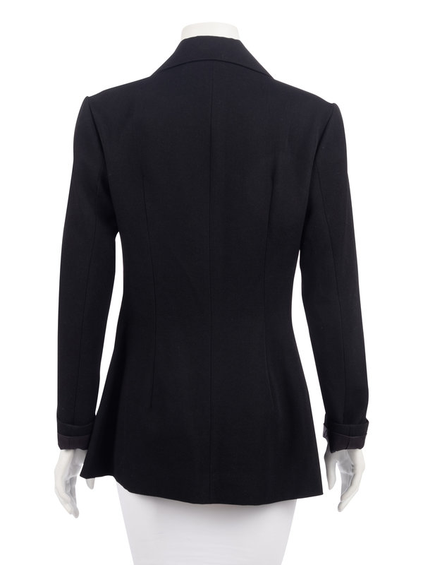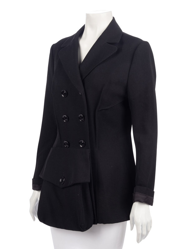 Black wool surge double breasted jacket with right front hip detachable pouch and outer shaping details.